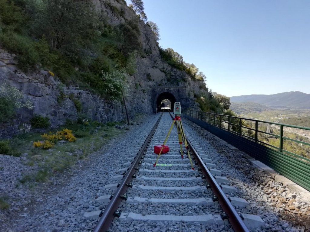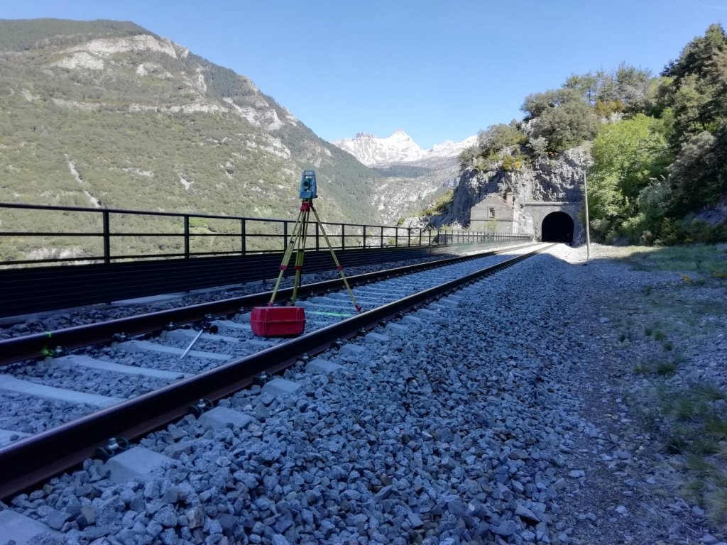 Trabajo de topografía en la línea férrea del Canfranc